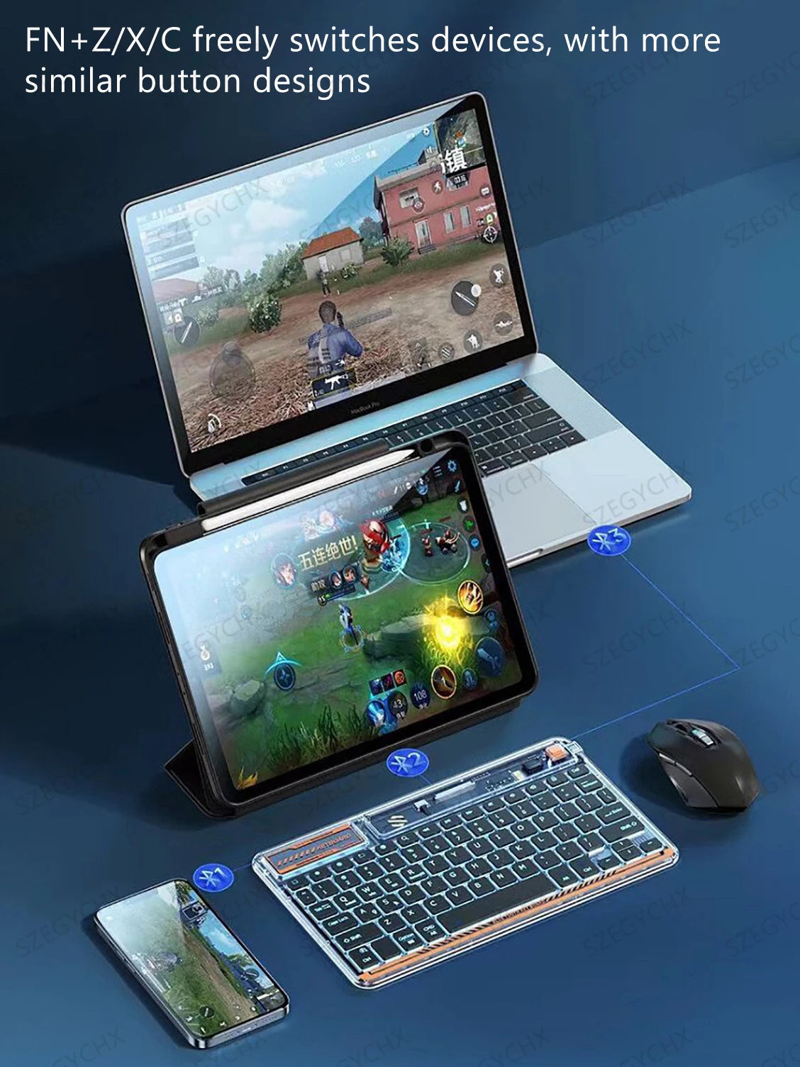Connexion multi-appareils-Ce clavier dispose de trois canaux Bluetooth indépendants. Une fois l'appairage des trois canaux terminé, appuyez sur FN + Q/W/E pour changer les appareils connectés. Distance de connexion sans fil jusqu'à 10m.