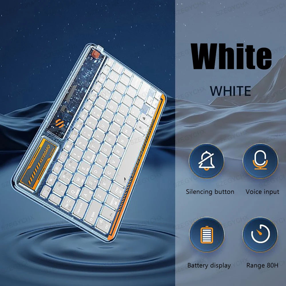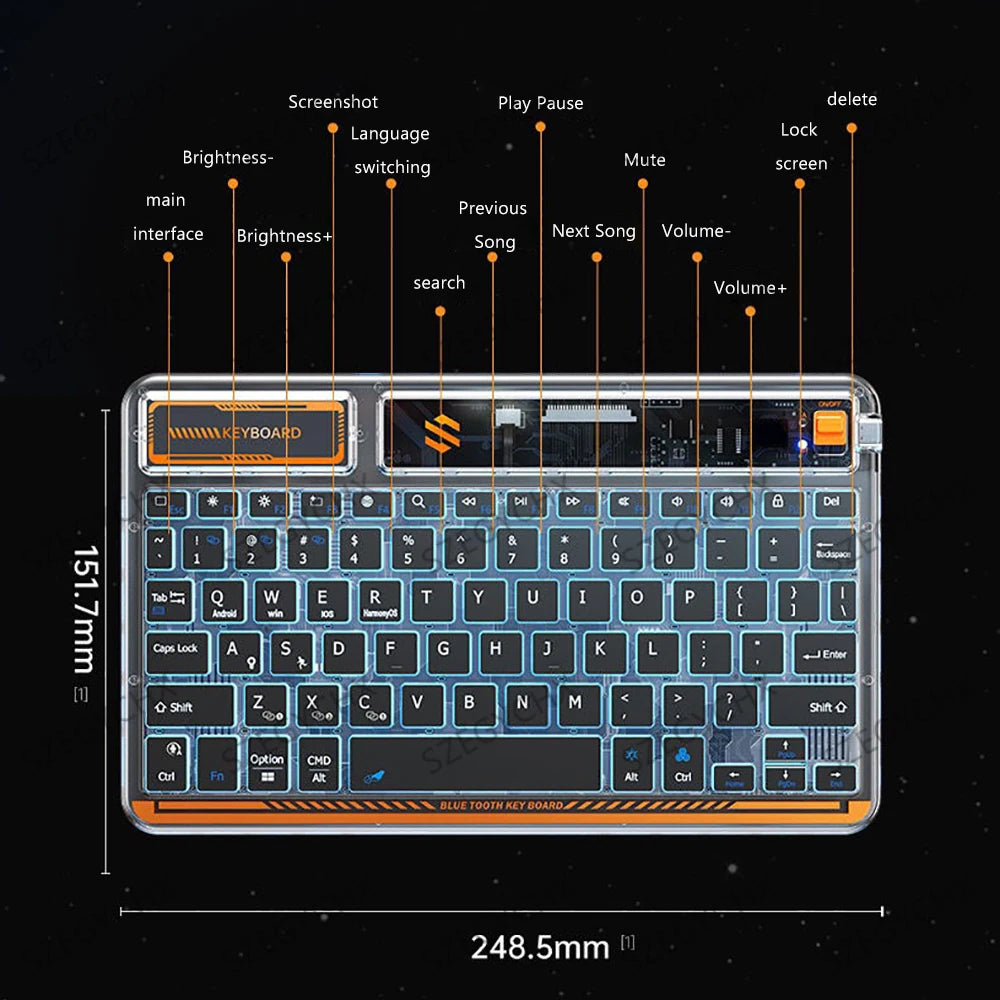 Clavier Bluetooth sans fil au design transparent avec rétroéclairage, compatible tablettes, smartphones et ordinateurs. Compact et léger, idéal pour le travail mobile ou un setup moderne.