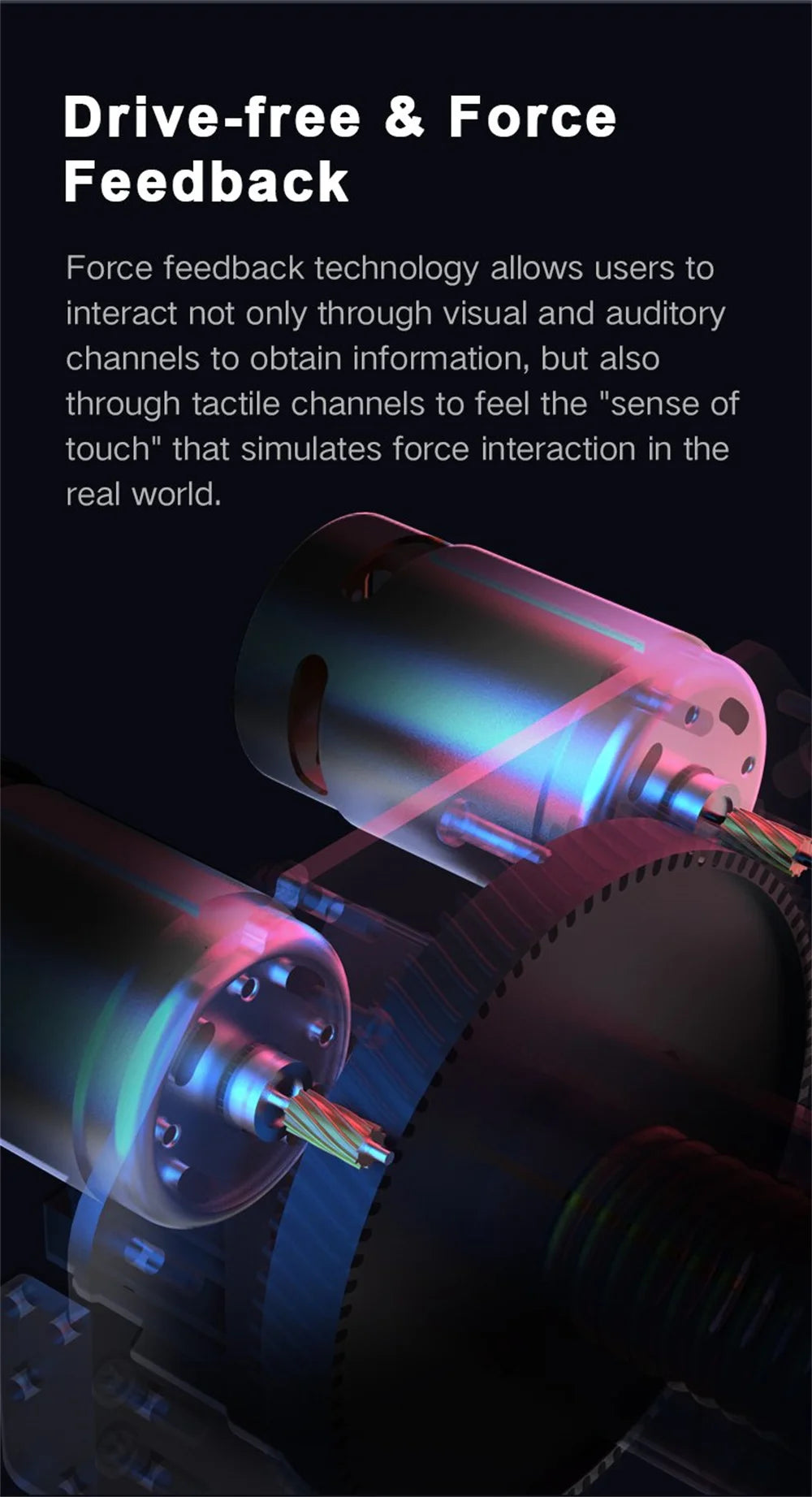 La technologie Force Feedback permet aux utilisateurs d'interagir non seulement à travers les canaux visuels et auditifs pour obtenir des informations, mais aussi à travers les canaux tactiles pour ressentir le «sens du toucher» qui simule la force insteraction dans le monde réel.