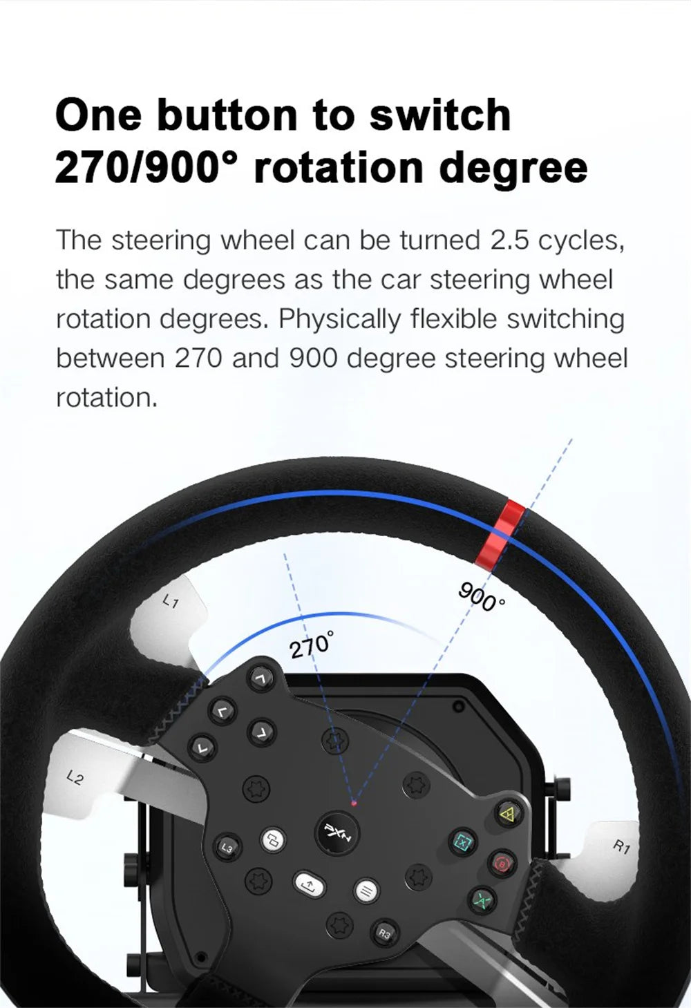 Le volant peut être tourné à 2.5 cycles, les mêmes degrés que les degrés de rotation du volant de la voiture. Commutation physiquement flexible entre 270 et 900 degrés de rotation du volant.